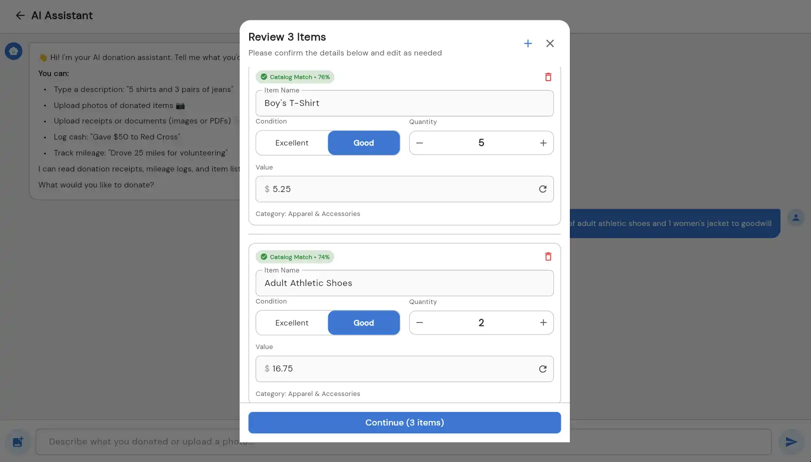 Chat naturally with our AI assistant to log any type of donation — goods, cash, or mileage. Upload photos of items, snap receipts, or describe what you donated. The AI extracts all the details including item names, conditions, and fair market values.